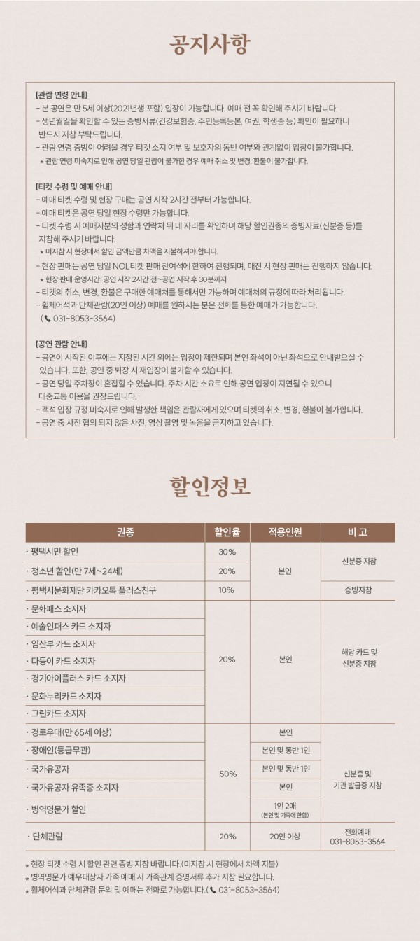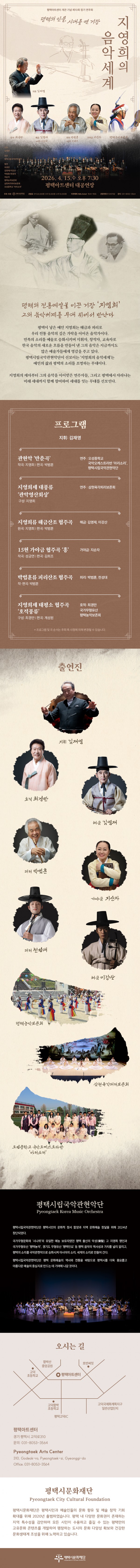 지영희의 음악세계 일시 2026.04.15 (수)19:30 장소 평택아트센터 대공연장 공연시간 90분(인터미션 없음) 지휘 김재영 출연 최경만, 김영재, 박범훈, 지순자, 평택농악보존회, 삼현육각피리보존회, 오성중학교 '아리소리' 외 관람연령 만 5세 이상 티켓가격 R석 20,000원/S석 15,000원/A석 10,000원 주최/주관 (재)평택시문화재단 문의 031-8053-3564 예매하기 상세정보 목록