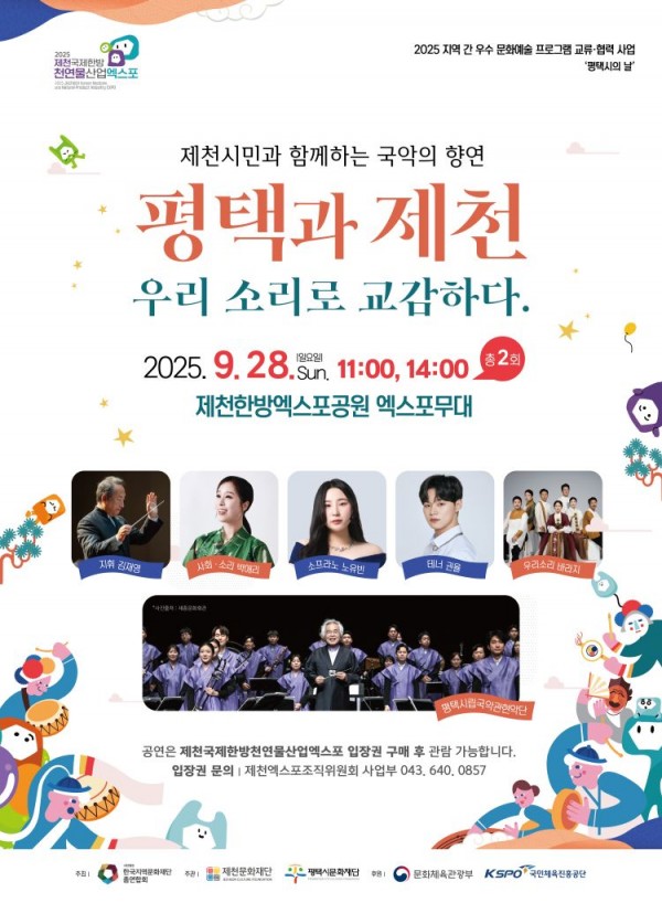 [초청] 지역 간 우수 문화예술 프로그램 교류 협력사업 <평택과 제천, 우리 소리로 교감하다> 일 시 2025.09.28 (일) ~ 2025.09.28 (일) 11:00, 14:00 장 소 제천한방엑스포공원 야외엑스포무대 출연 사회 박애리, 양금 신자빈, 소프라노 노유빈, 테너 권율, 태평소 천성대, 우리소리 바라지 주최/주관 (사)한국지역문화재단총연합회/ 평택시문화재단, 제천문화재단 사진 리뷰기사1 본문 상세정보 목록